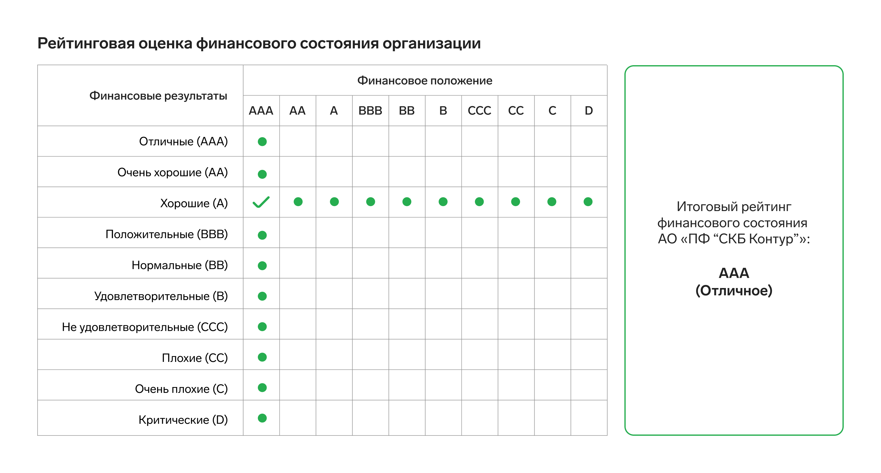 Кроме того, Контур.Фокус присваивает компании итоговый рейтинг по собственной методике. Максимальная оценка «ААА» свидетельствует об отличном финансовом состоянии. Минимальная оценка D говорит о банкротстве контрагента и невозможности исполнения принятых обязательств.