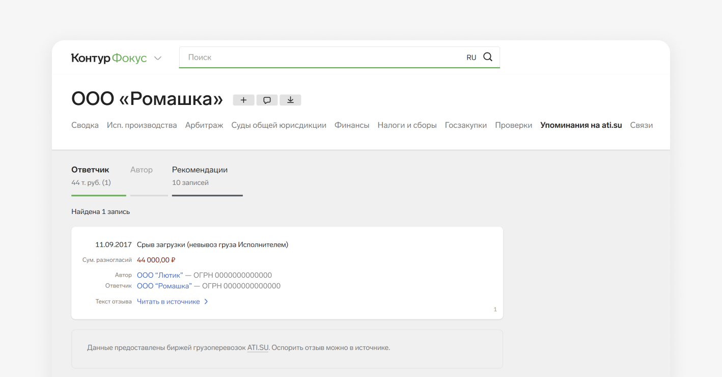 Отзывы с портала ATI.SU показывает Контур.Фокус. В сервисе можно проверить, есть ли о грузоперевозчике негативные отзывы и когда они написаны, изучить суммы ущерба. Помимо негативных отзывов, Фокус показывает рекомендации перевозчиков, которые оставили пользователи портала.