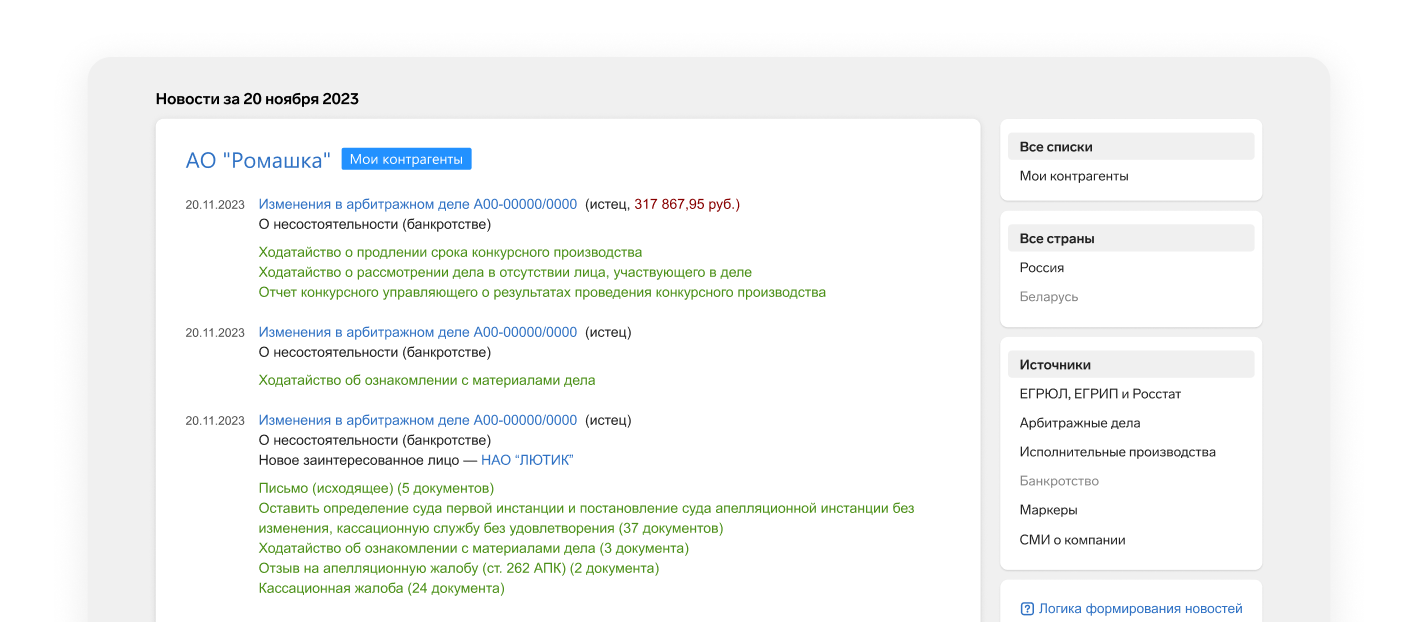 Чтобы заранее заметить тревожные признаки, расторгнуть договор и найти нового контрагента, поставьте компанию на наблюдение в Контур.Фокусе. Если у фирмы произойдет что-то важное, сервис уведомит об этом. Ленту уведомлений можно настроить под себя.