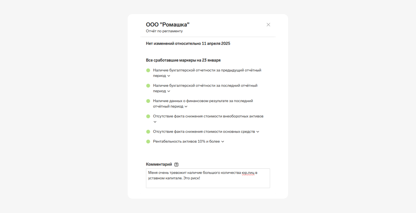 К блоку Скоринга, как и любому другому блоку отчета по регламенту, можно оставить комментарий. Например, написать предварительный вывод и зафиксировать его в результатах проверки.