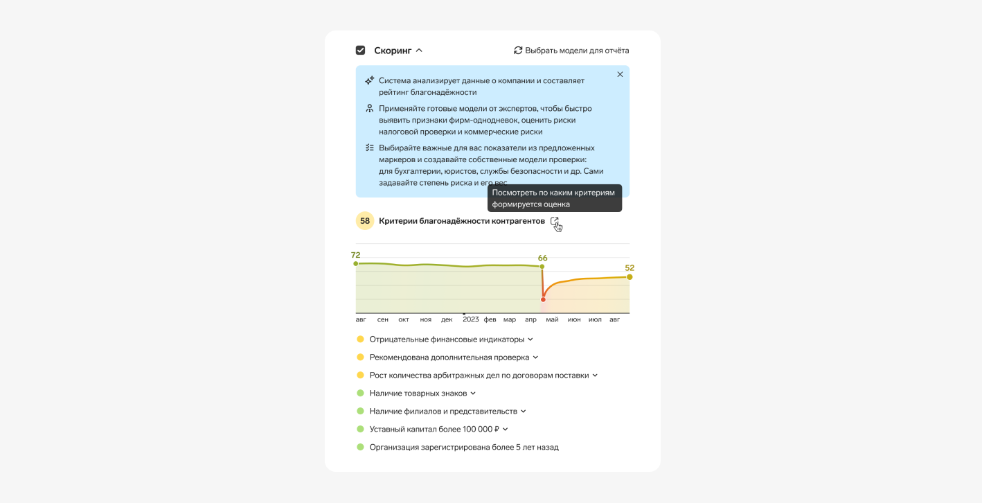 Скоринг помогает быстро оценить репутацию контрагента, снизить риск сотрудничества с ненадежным партнером и повысить эффективность процесса проверки. Кроме этого, Скоринг позволяет: