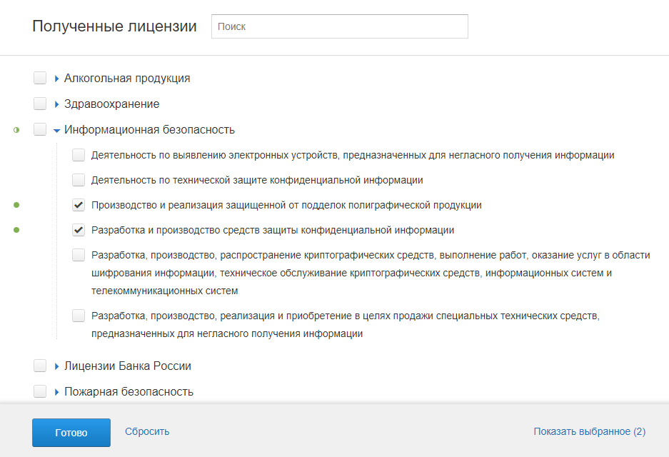 Факт получения лицензий на определенные виды деятельности (например, на розничную продажу алкогольной продукции) может служить более надежным признаком для отбора подходящих контрагентов. Для поиска компаний, которые получали те или иные лицензии, появился отдельный фильтр: