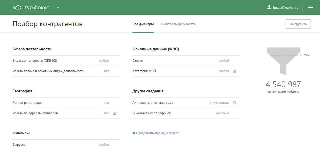 Для формирования выборки необходимо настроить фильтры. Например, вид деятельности (код ОКВЭД), регион, размер выручки, статус организации, наличие контактов. Доступные для отбора критерии будут постепенно дополняться на основе пожеланий пользователей.