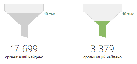 Для просмотра примеров из получившейся выборки достаточно применить хотя бы один фильтр, а для выгрузки результатов в Excel — настроить фильтры таким образом, чтобы количество организаций в выборке не превышало 10 000.