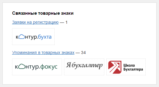 При осуществлении поиска по запросу, содаржащему название товарного знака, в результатах поиска будут выше показаны организации, обладающие правами на данный товарный знак. Кроме того, в блоке организации будут показаны товарные знаки, которые сервис посчитал близкими запросу.
