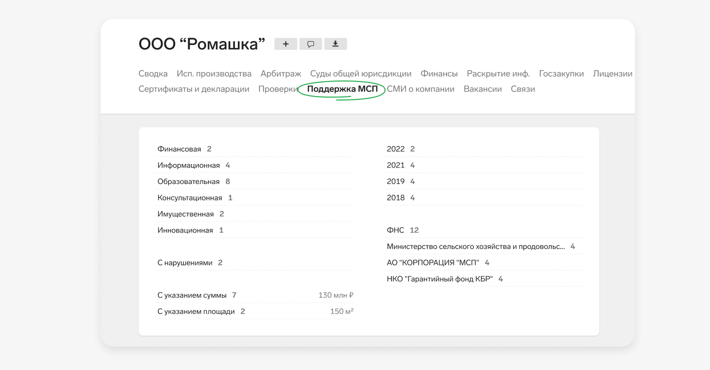 Основные сведения отражены в карточке контрагента в блоке «Поддержка МСП». Там можно увидеть разные виды господдержки: