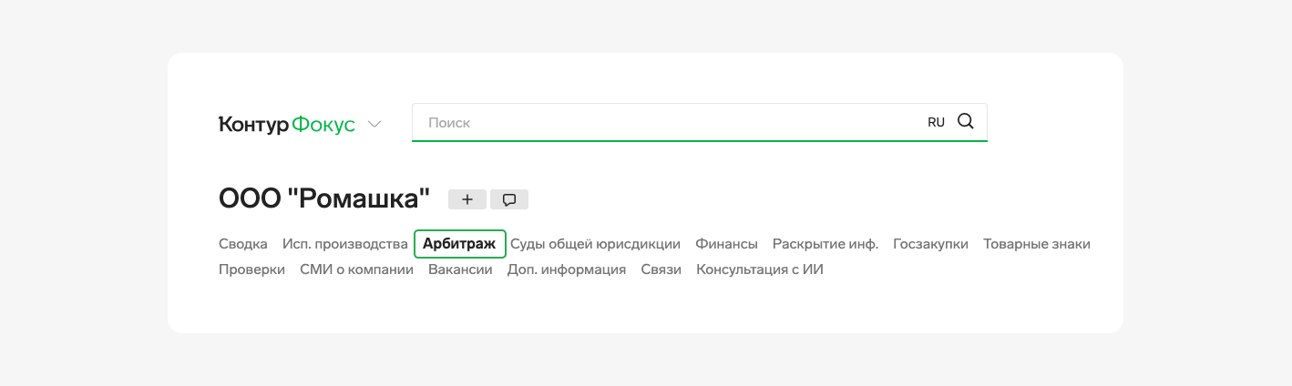 Для подробного изучения арбитражных дел контрагента, введите ИНН или название компании в поиск Фокуса. Изучите краткую информацию об арбитражах на Сводке. Для детального изучения раздела перейдите в раздел «Арбитраж».