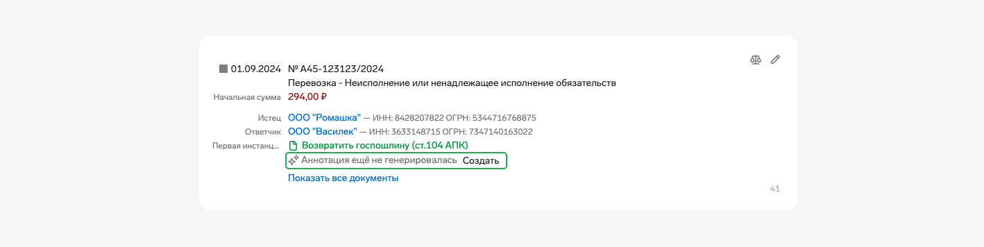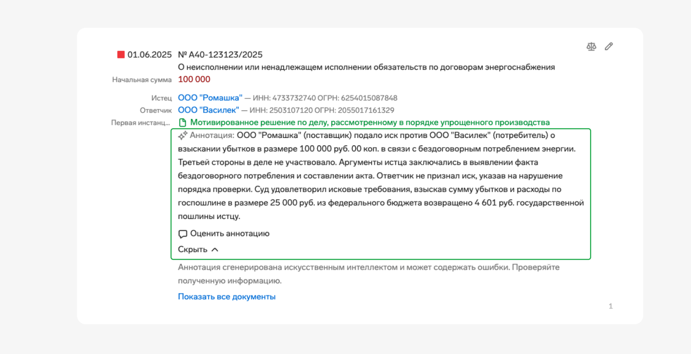 Если документ содержит только краткий текст, в ИИ-аннотации будет указан предмет спора, решение суда и итоговая сумма иска. Если же документ содержит полный текст решения, в ИИ-аннотации, помимо этого, будут указаны роли сторон по договору, который стал причиной спора, аргументы сторон и суда.