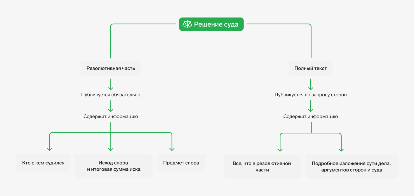 В самом документе с решением может быть представлен краткий (резолютивная часть) или полный текст. Отличия показаны на схеме: