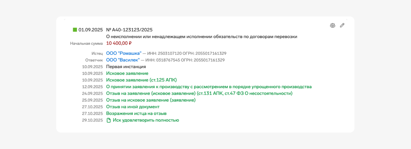 Например, если вы выбираете поставщика, обратите внимание на судебные иски в качестве ответчика с его участием. В решении суда может быть информация о том, что пошло не так — поставщик не поставил товар, сорвал сроки, поставил товар ненадлежащего качества. Это поможет разобраться, ждать ли проблем от сотрудничества с таким контрагентом, и каких конкретно проблем можно ожидать. Кроме этого, с помощью аналитики арбитражей можно собрать доказательственную базу для суда.