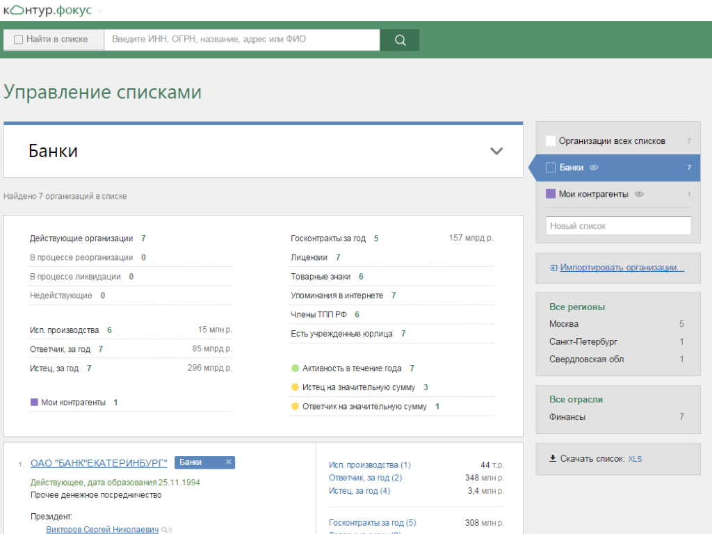 При формировании списка можно увидеть подробную сводку по каждой организации. Маркеры, определяющие критерии проверки, позволяют найти наиболее интересные организации в списке. В списках также есть возможность поиска и расклад по отраслям.